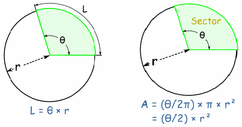 The same logic can be used to find the formula for the area of a sector, illustrated above right.