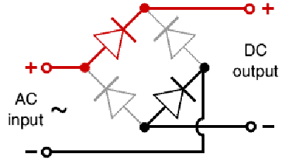 There are several ways of connecting diodes to make a rectifier to convert AC to DC. The bridge rectifier is one of them and it is available in special packages containing the four diodes required. Bridge rectifiers are rated by their maximum current and maximum reverse voltage. They have four leads or terminals: the two DC outputs are labelled + and -.