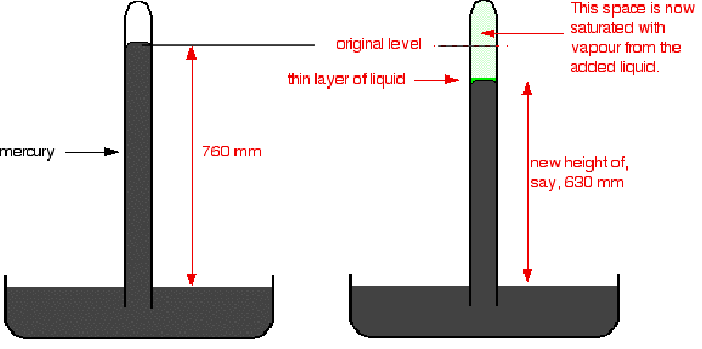 In the diagram below a small amount of liquid introduced at the top of the mercury column results in the column dropping from 760 mm to 630 mm. The saturated vapour pressure of the liquid is 130 mm.