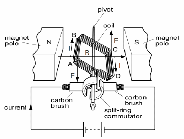 The purpose of a dc motor is to produce movement from a battery. If a current is passed through a coil positioned in a magnetic field, the coil will experience a force according to Fleming's Left Hand Rule. The left hand of the coil AB will experience an upwards force and the right hand side CD of the coil will experience a downwards force. When the coil reaches the vertical position the commutator changes polarity. This means that current will reverse direction in the coil, but since the coil has undergone a half turn, CD is on the left and AB is on the right. Now CD experiences and upwards force, AB experiences a downwards force and the coil continues to turn in the same sense -clockwise above.